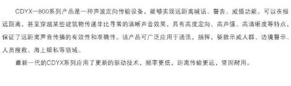 ? ? ? ▼動(dòng)亂、暴亂、騷亂現(xiàn)場(chǎng),暴徒喪心病狂,受蠱惑的群眾也可能情緒失控,警察法規(guī)說(shuō)教不可能動(dòng)搖其心理防線,動(dòng)槍動(dòng)棒恐傷無(wú)辜,釋放催淚瓦斯又有失人道,而“聲霸”精準(zhǔn)瞄準(zhǔn)其骨干分子,高分貝施壓,使起聽覺(jué)神經(jīng)無(wú)力招架,被迫撤離,既能有效控制局面,平息大亂,又不致命、致傷、致殘,彰顯文明執(zhí)法。